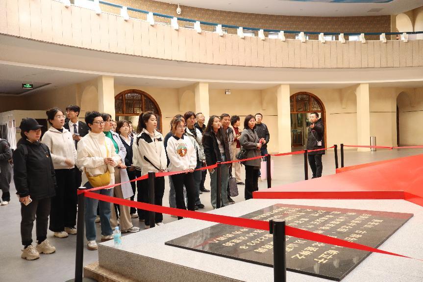上午,师生一行来到晋绥解放区烈士陵园,苍松翠柏下,烈士丰碑前,师生们默哀、敬献鲜花,表达对英烈的深切缅怀与崇高敬意。贾嵘同学诵读《写给先烈们的一封信》情感真挚,字字铿锵,唤起在场每个人的共鸣。随后,师生一行参观了“四八”烈士纪念馆,了解黑茶山空难历史,重温先烈英勇事迹,宣讲员乔博深情朗诵《守护信仰的丰碑——“四八”烈士纪念馆里的忠诚赞歌》,师生们深受感动。
