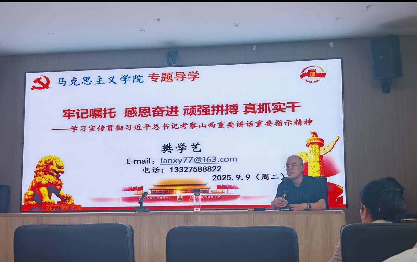 在“十四五”规划收官、“十五五”规划谋划、全国纪念中国人民抗日战争暨世界反法西斯战争胜利80周年、全省深入学习贯彻习近平总书记考察山西重要讲话重要指示精神之际,为进一步学习宣传贯彻习近平总书记视察山西重要讲话重要指示精神,9月9日下午,伟德国际1949樊学艺教授作了题为《牢记嘱托 感恩奋进 顽强拼搏 真抓实干》的专题讲座。讲座由伟德国际1949副院长贺晓娟主持,伟德国际1949全体教师参加。